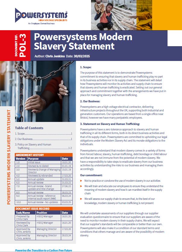 As a leading high-voltage electrical contractor operating across the UK, Powersystems works with a wide network of suppliers and contractors. We implement robust due diligence processes, including supplier evaluations, Right to Work checks, and ongoing staff training, to ensure compliance and ethical integrity. We expect our suppliers to meet or exceed our standards and take immediate action if any breach is identified.