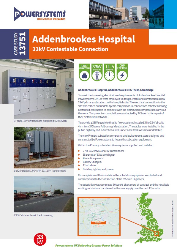 Download the full Addenbrooke’s Hospital Case Study to explore how Powersystems delivered a new 33 kV contestable connection and primary substation for one of the UK’s most advanced teaching and research hospitals. The PDF outlines our complete design, construction and commissioning works, including 4 km of 33 kV circuits, substation development, transformer installation and protection upgrades. Ideal for engineers, estates teams and healthcare‑infrastructure planners seeking insight into a major HV upgrade that strengthens resilience, supports clinical excellence and future‑proofs the fast‑growing Cambridge Biomedical Campus.