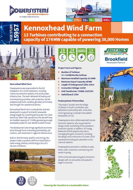 | Powersystems Fact | Powersystems has connected over 24% of the UK’s wind farms. Kennoxhead marks another successful collaboration with Jones Bros and Brookfield Renewable UK Ltd. |
