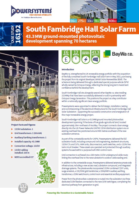 | Powersystems Fact: | Powersystems has delivered high-voltage grid connections for some of the UK’s largest solar projects, providing safe, efficient and resilient infrastructure that supports the UK’s transition to clean energy. |